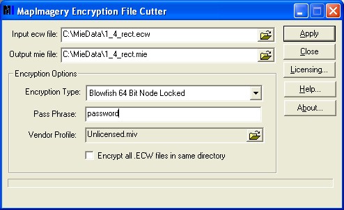 GeneralThis tool is used to create encrypted MIE image files, using a pass phrase, and other options. The tool takes an ECW file as input, and writes an MIE file as output, using the chosen Encryption Type, Pass Phrase, and other options, to encode the file. Dialog SnapshotDetailed InstructionsThe Input ecw file: field is for entering the input file to encrypt. You can type the file name directly in, or click on the browser button to choose the file using a file chooser. When you choose an Input file, the Outut mie file: field defaults to the input file name, with the extension changed to .MIE. You can change the name or location of the output file, either directly via typing, or using the browser button, to choose using a file chooser. The Encryption Type: option allows you to use the encoding method used to encrypt your file. A range of encoding methods are available, including test methods for understanding and evaluating the MapImagery Encryption set of tools. Additional methods will be added as these are developed. The table below shows the existing methods and methods planned for the next release.